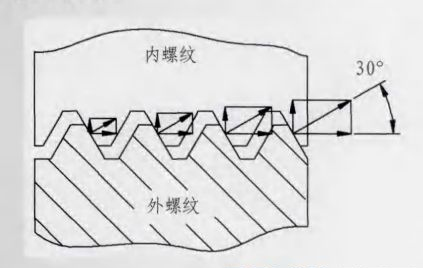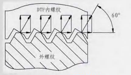 DTFLOCK螺母在內(nèi)螺紋的牙底處有一個30°的楔形斜面,當(dāng)螺栓、螺母擰緊時,螺栓的牙尖就緊緊地頂在螺母的楔形斜面上,從而產(chǎn)生了很大的鎖緊力。由于牙形的角度改變,使施加在螺紋間接觸所產(chǎn)生的法向力與螺栓軸成60°角(見圖2),而不是像普通螺紋那樣的30°角,DTFLOCK螺紋法向壓力遠(yuǎn)遠(yuǎn)大于扣緊壓力,因此,所產(chǎn)生的防松摩擦力也就必然大大增加了。